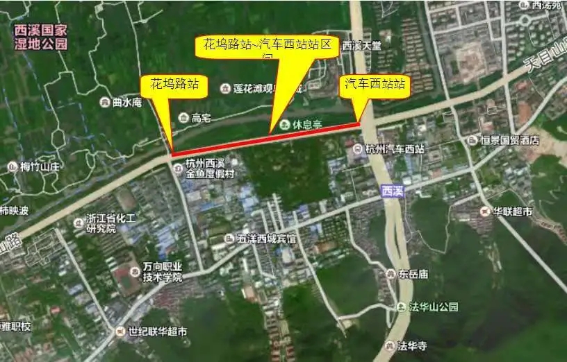 杭州地鐵3號線花塢路站~汽車西站站區(qū)間,該區(qū)間沿天目山路敷設,規(guī)劃有地下快速路隧道,沿線北側(cè)為沿山河,西溪濕地公園,南側(cè)為軍事及公共用地,隧道下穿擬建天目山快速路隧道及周邊建筑物