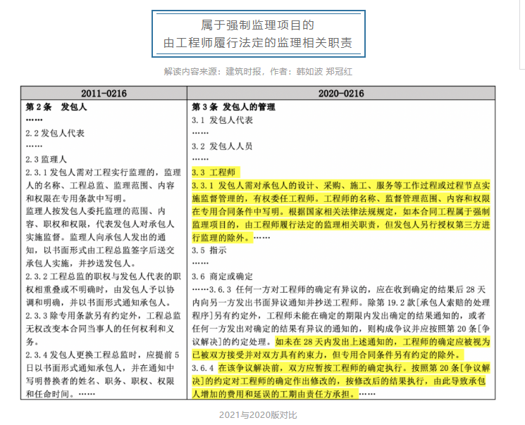 新版合同中并未沿用2011版合同示范文本中的“監(jiān)理人”角色,而是通過[3.3工程師]“根據(jù)國家相關(guān)法律法規(guī)規(guī)定,如本合同工程屬于強(qiáng)制監(jiān)理項目的,由工程師履行法定的監(jiān)理相關(guān)職責(zé)”的約定,將“工程師”與監(jiān)理制度相關(guān)聯(lián)銜接,這是國家推行咨詢行業(yè)整合升級發(fā)展全過程工程咨詢理念的重要體現(xiàn),也是與住建部施工合同示范文本、九部委標(biāo)準(zhǔn)設(shè)計施工招標(biāo)文件中合同文本相比的重大突破。