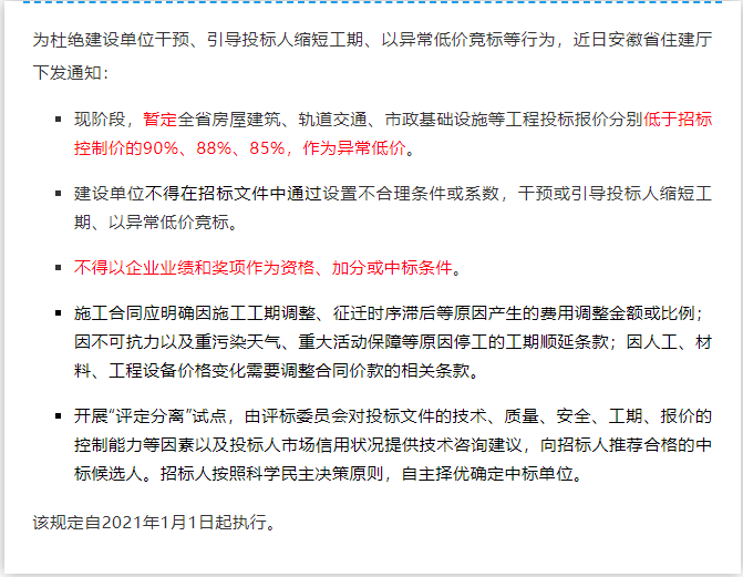 結(jié)合我省實際,現(xiàn)階段,暫定全省房屋建筑、軌道交通、市政基礎(chǔ)設(shè)施等工程投標(biāo)報價分別低于招標(biāo)控制價的90%、88%、85%,作為異常低價。