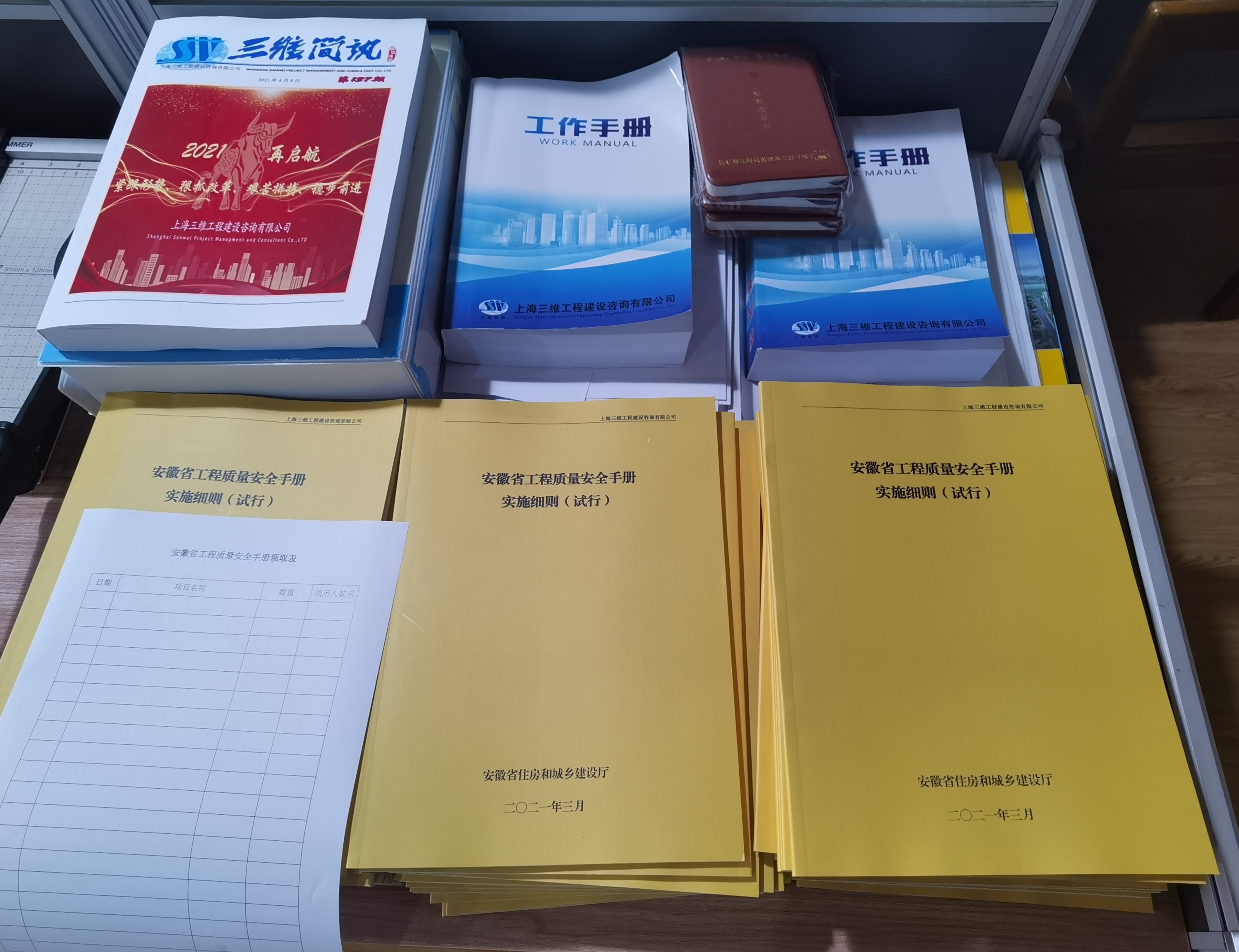 近期,安徽省住房和城鄉(xiāng)建設(shè)廳發(fā)布了《安徽省工程質(zhì)量安全手冊(cè)實(shí)施細(xì)則》(試行),為深入貫徹落實(shí)施工現(xiàn)場(chǎng)質(zhì)量和安全受控的方針和“安全第一、預(yù)防為主、綜合治理”的中心思想,上海三維工程建設(shè)咨詢(xún)有限公司黃山分公司組織在黃區(qū)域各項(xiàng)目監(jiān)理機(jī)構(gòu)對(duì)《安徽省工程質(zhì)量安全手冊(cè)實(shí)施細(xì)則》進(jìn)行印刷學(xué)習(xí)。