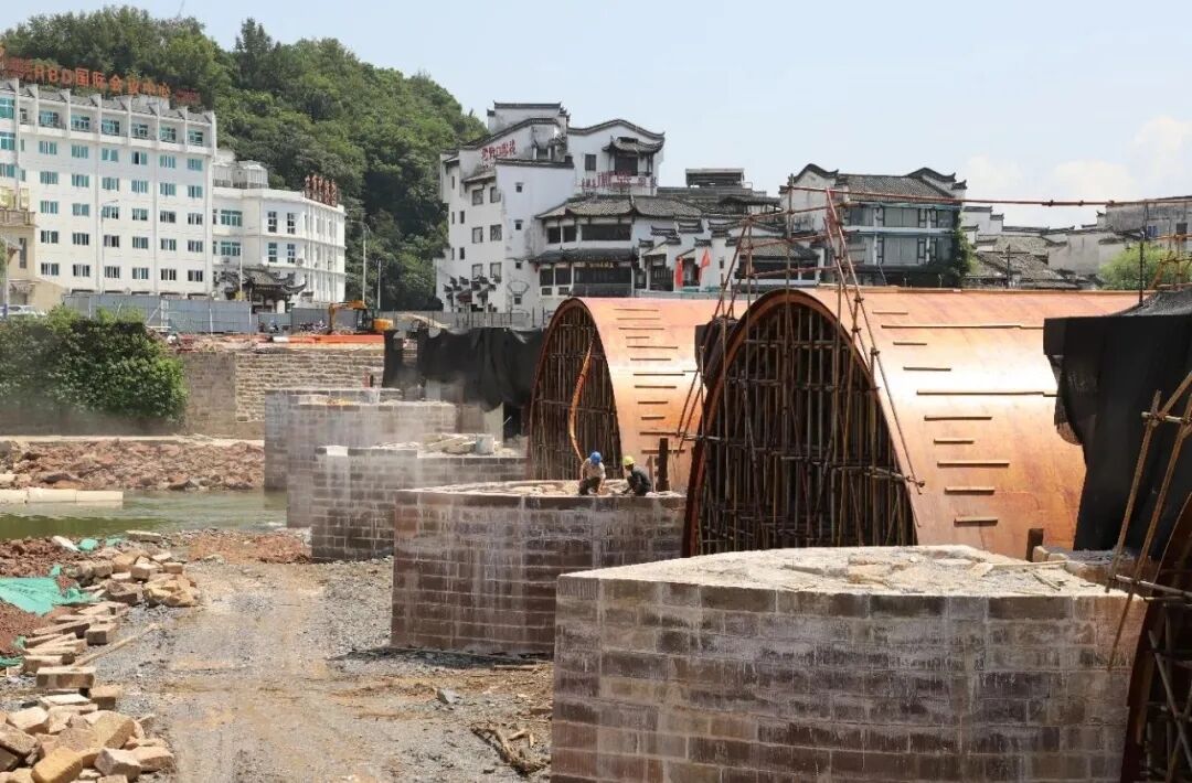 近日,我司監(jiān)理的國家級文物(屯溪鎮(zhèn)海橋/老大橋)修繕工程已進入關(guān)鍵工序節(jié)點、橋梁拱劵施工階段,現(xiàn)有的七個橋孔的三個拱券模板已完成制作,正開展第一跨拱券的砌筑工作。