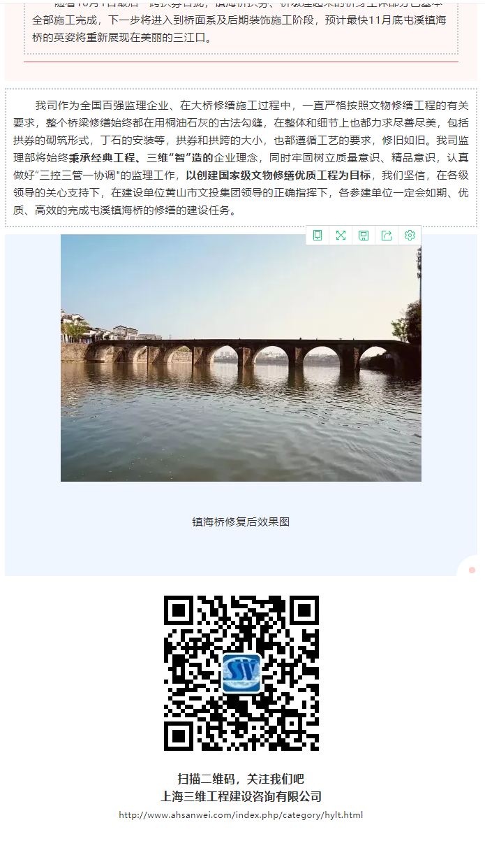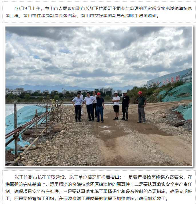 黃山市人民政府副市長(zhǎng)張正竹調(diào)研我司參與監(jiān)理的國(guó)家級(jí)文物(鎮(zhèn)海橋/老大橋)修繕工程