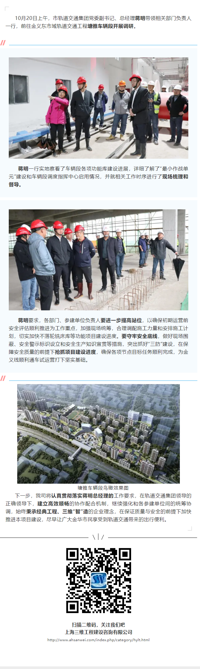 金華市軌道交通集團黨委副書記、總經(jīng)理蔣明赴我司監(jiān)理的金義東市域軌道交通工程塘雅車輛段開展調(diào)研
