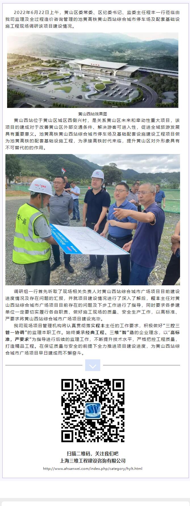 黃山區(qū)委常委、區(qū)紀(jì)委書(shū)記、監(jiān)委主任程豐一行調(diào)研我司監(jiān)理及全過(guò)程造價(jià)咨詢(xún)管理的池黃高鐵黃山西站綜合城市廣場(chǎng)項(xiàng)目
